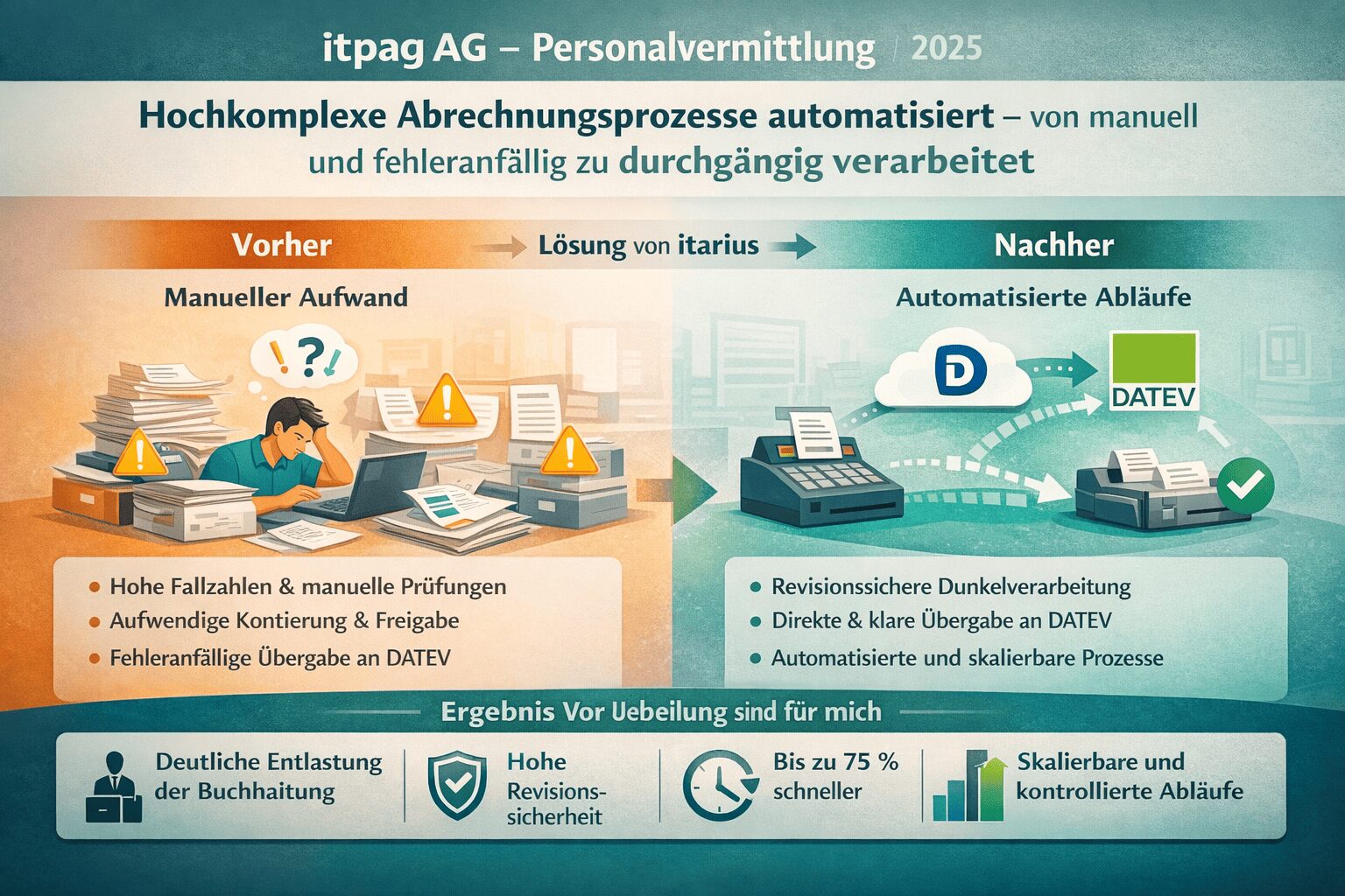 Die itpag AG ist ein Unternehmen aus der Personalvermittlung mit stark wachsendem Kunden- und Belegvolumen. Mit steigender Anzahl an Kunden nahmen auch die fachlichen Sonderfälle und der Bearbeitungsaufwand in der Buchhaltung zu. Kernprobleme im Alltag: